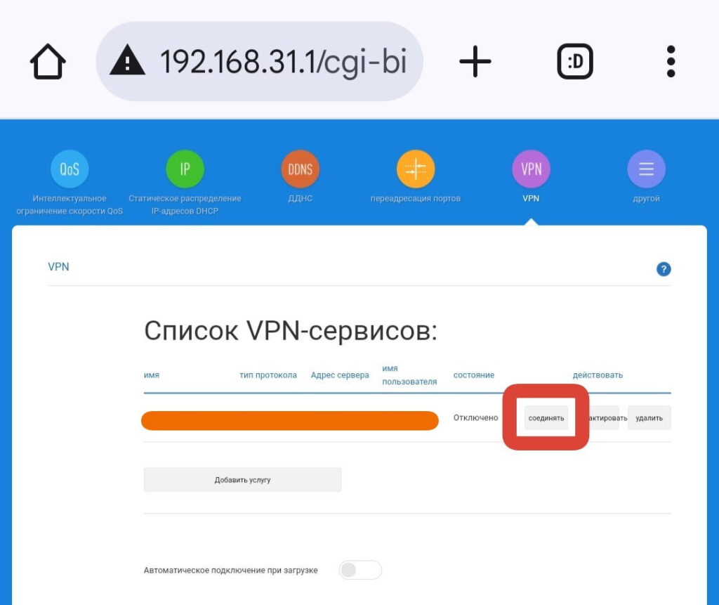 Сервис должен быть добавлен в список и можно нажать кнопку -> соединять.
