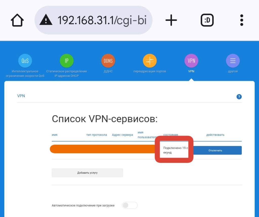 Нажмите Сохранить, затем активируйте подключение. В списке VPN‑соединений статус должен измениться на «Подключено».